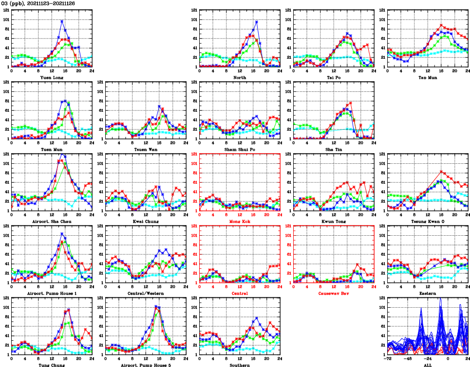 | Air Quality Data Time Series for O3 (2021/11/26) | ( Line colors: Day -3 Day -2 Day -1 Current day ) | 2D Map Current AQHI |