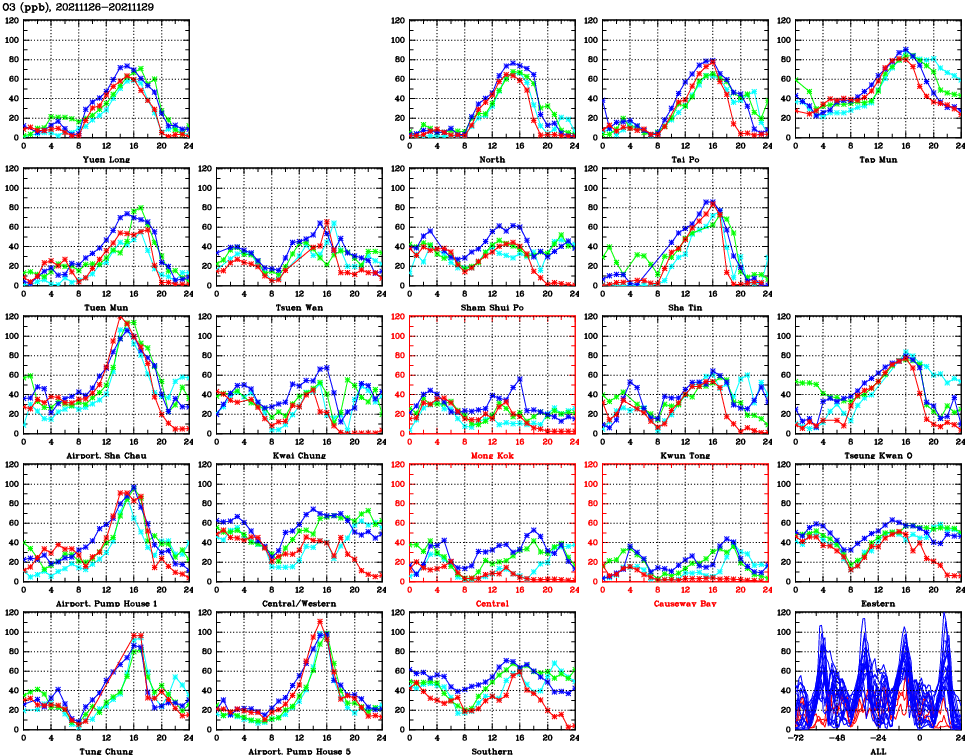 | Air Quality Data Time Series for O3 (2021/11/29) | ( Line colors: Day -3 Day -2 Day -1 Current day ) | 2D Map Current AQHI |