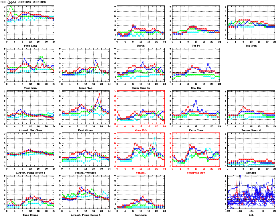 | Air Quality Data Time Series for SO2 (2021/11/26) | ( Line colors: Day -3 Day -2 Day -1 Current day ) | 2D Map Current AQHI |