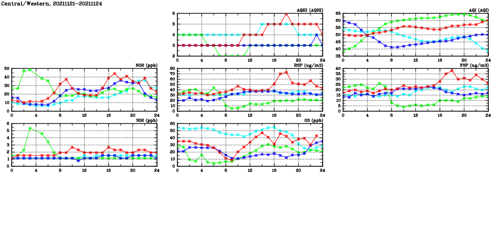 | Air Quality Data Time Series in Central/Western (2021/11/24) | ( Line colors: Day -3 Day -2 Day -1 Current day ) | 2D Map Current AQHI |