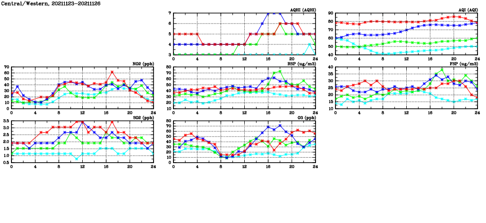 | Air Quality Data Time Series in Central/Western (2021/11/26) | ( Line colors: Day -3 Day -2 Day -1 Current day ) | 2D Map Current AQHI |