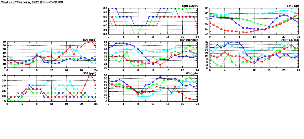 | Air Quality Data Time Series in Central/Western (2021/11/29) | ( Line colors: Day -3 Day -2 Day -1 Current day ) | 2D Map Current AQHI |