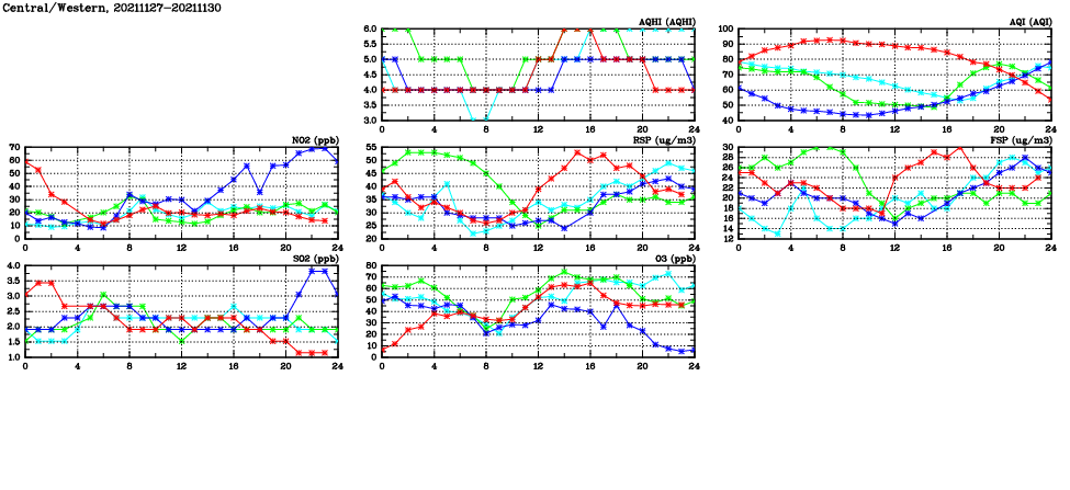 | Air Quality Data Time Series in Central/Western (2021/11/30) | ( Line colors: Day -3 Day -2 Day -1 Current day ) | 2D Map Current AQHI |