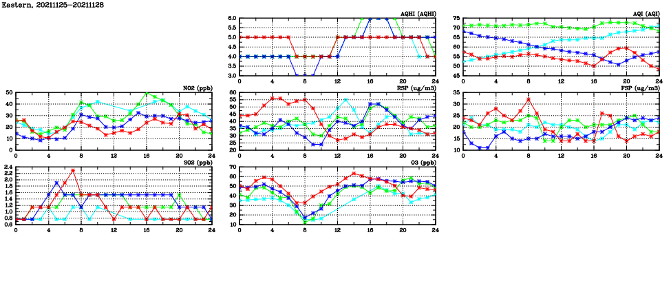 | Air Quality Data Time Series in Eastern (2021/11/28) | ( Line colors: Day -3 Day -2 Day -1 Current day ) | 2D Map Current AQHI |