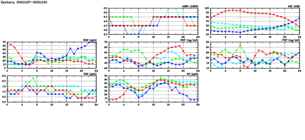 | Air Quality Data Time Series in Eastern (2021/11/30) | ( Line colors: Day -3 Day -2 Day -1 Current day ) | 2D Map Current AQHI |