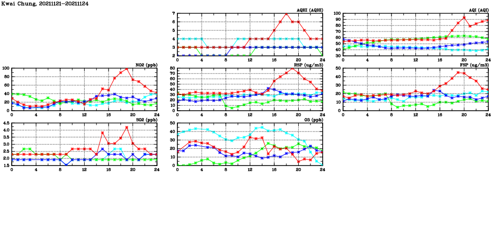 | Air Quality Data Time Series in Kwai Chung (2021/11/24) | ( Line colors: Day -3 Day -2 Day -1 Current day ) | 2D Map Current AQHI |