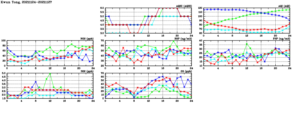 | Air Quality Data Time Series in Kwun Tong (2021/11/27) | ( Line colors: Day -3 Day -2 Day -1 Current day ) | 2D Map Current AQHI |
