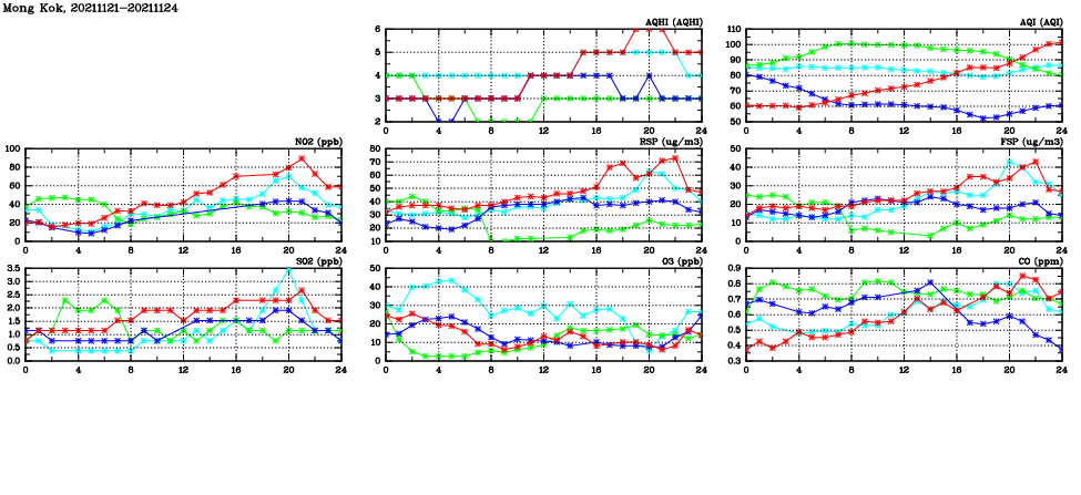 | Air Quality Data Time Series in Mong Kok (2021/11/24) | ( Line colors: Day -3 Day -2 Day -1 Current day ) | 2D Map Current AQHI |