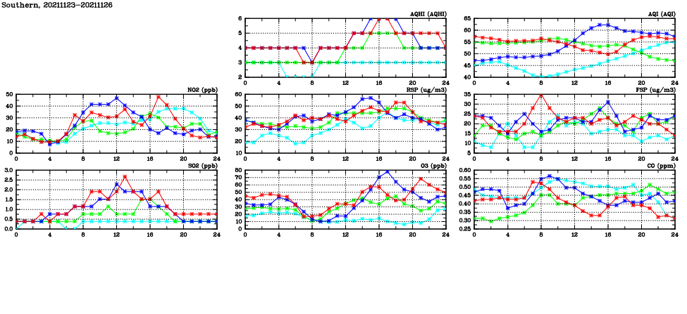 | Air Quality Data Time Series in Southern (2021/11/26) | ( Line colors: Day -3 Day -2 Day -1 Current day ) | 2D Map Current AQHI |