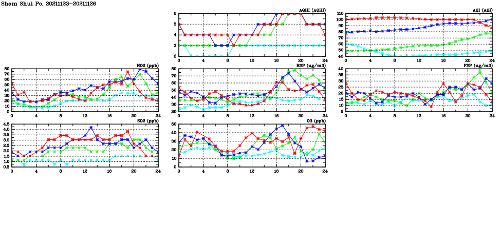 | Air Quality Data Time Series in Sham Shui Po (2021/11/26) | ( Line colors: Day -3 Day -2 Day -1 Current day ) | 2D Map Current AQHI |