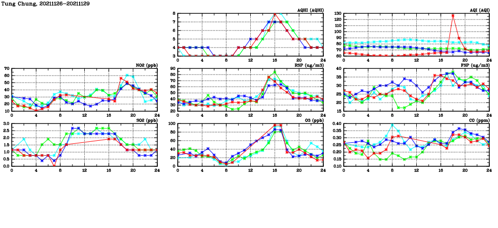 | Air Quality Data Time Series in Tung Chung (2021/11/29) | ( Line colors: Day -3 Day -2 Day -1 Current day ) | 2D Map Current AQHI |