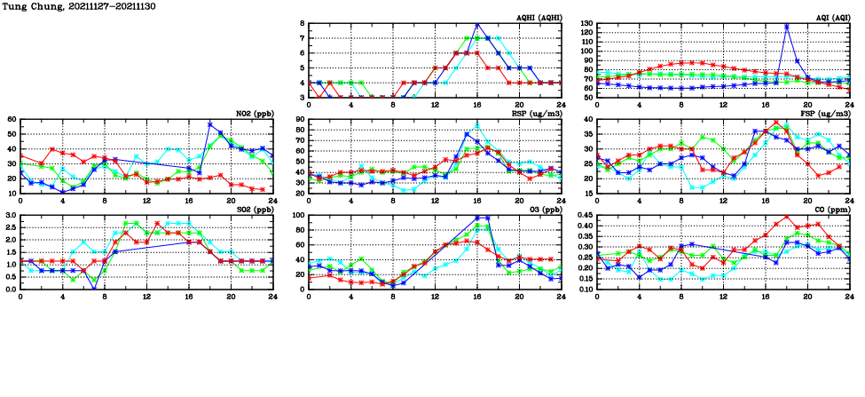 | Air Quality Data Time Series in Tung Chung (2021/11/30) | ( Line colors: Day -3 Day -2 Day -1 Current day ) | 2D Map Current AQHI |