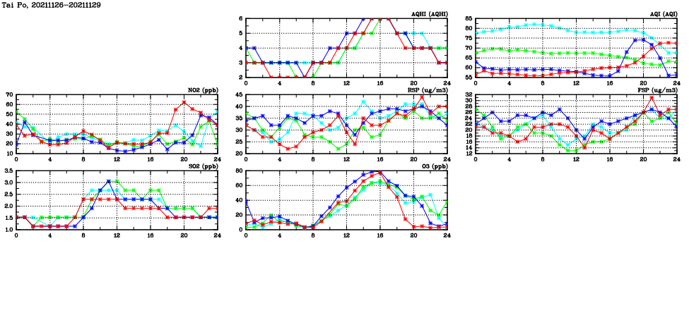 | Air Quality Data Time Series in Tai Po (2021/11/29) | ( Line colors: Day -3 Day -2 Day -1 Current day ) | 2D Map Current AQHI |