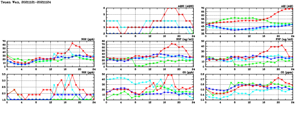 | Air Quality Data Time Series in Tsuen Wan (2021/11/24) | ( Line colors: Day -3 Day -2 Day -1 Current day ) | 2D Map Current AQHI |
