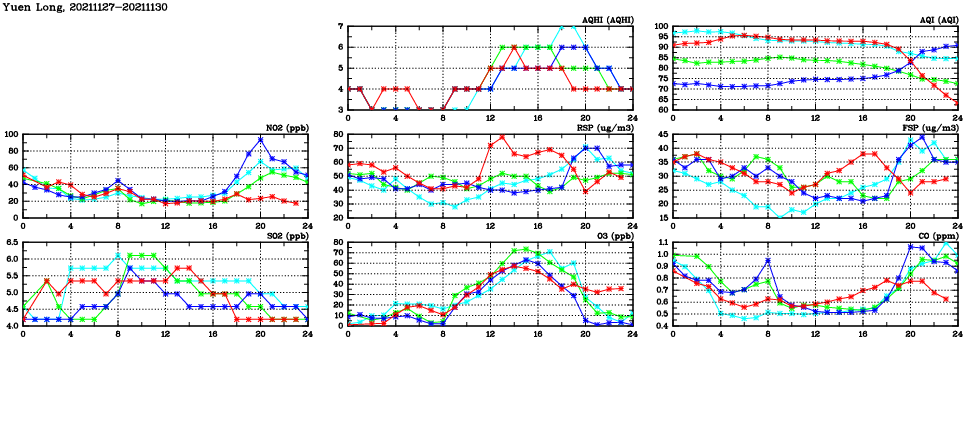 | Air Quality Data Time Series in Yuen Long (2021/11/30) | ( Line colors: Day -3 Day -2 Day -1 Current day ) | 2D Map Current AQHI |