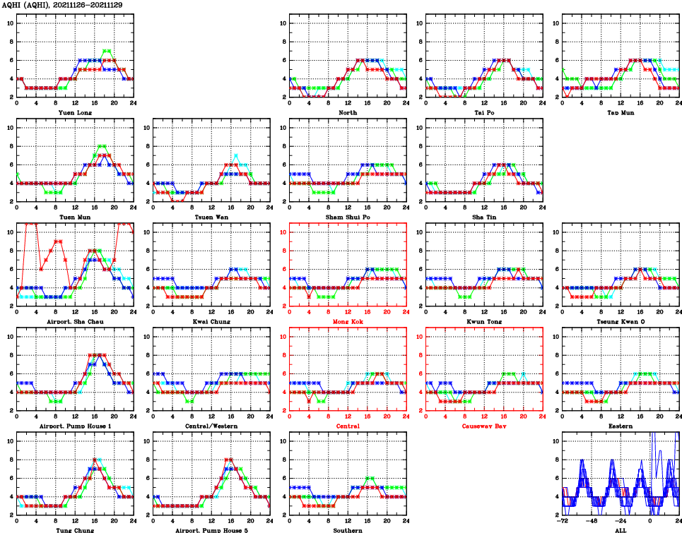 | Air Quality Data Time Series for AQHI (2021/11/29) | ( Line colors: Day -3 Day -2 Day -1 Current day ) | 2D Map Current AQHI |
