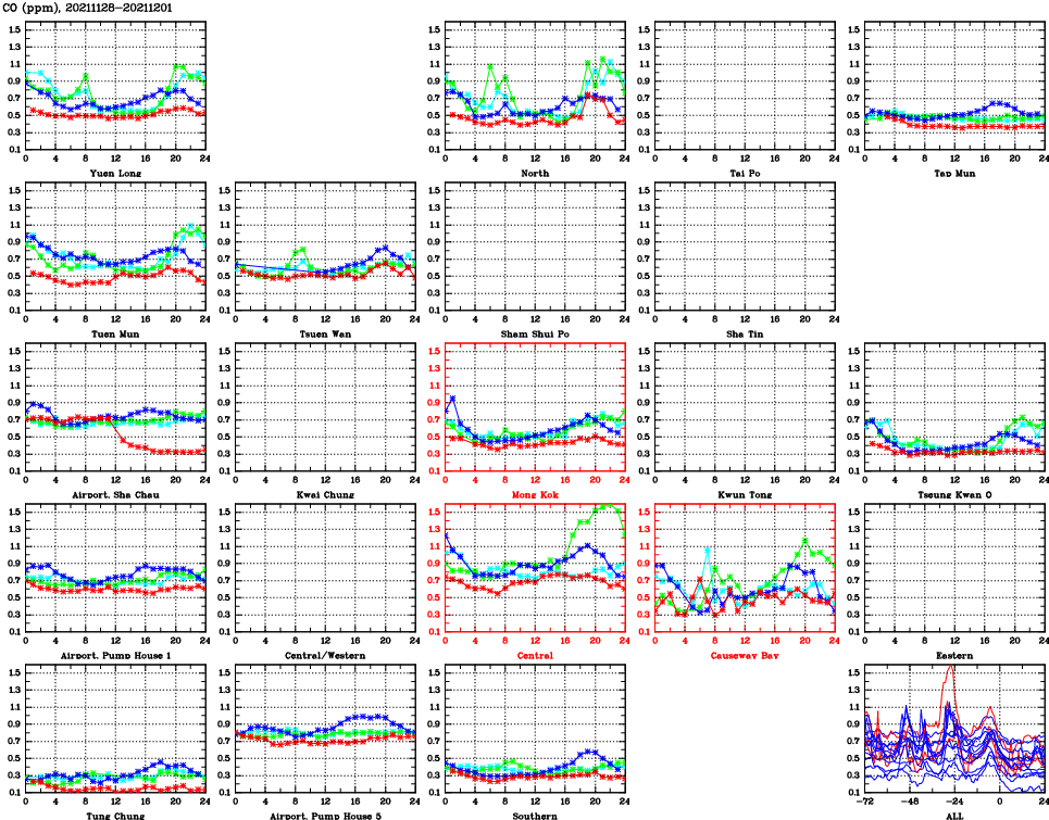 | Air Quality Data Time Series for CO (2021/12/01) | ( Line colors: Day -3 Day -2 Day -1 Current day ) | 2D Map Current AQHI |
