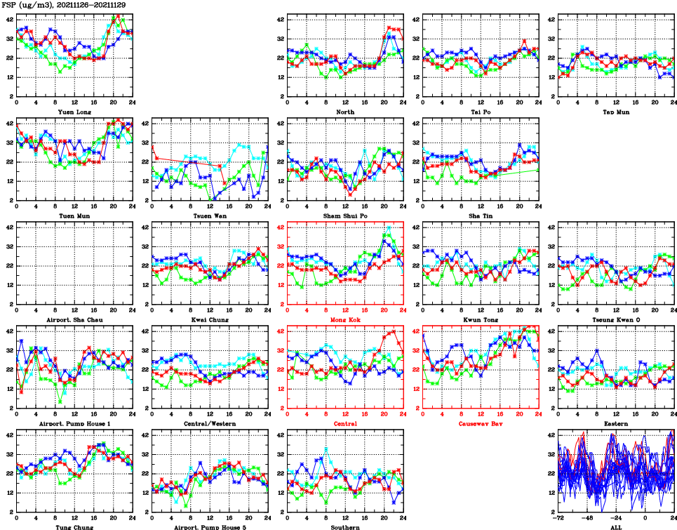 | Air Quality Data Time Series for FSP (2021/11/29) | ( Line colors: Day -3 Day -2 Day -1 Current day ) | 2D Map Current AQHI |