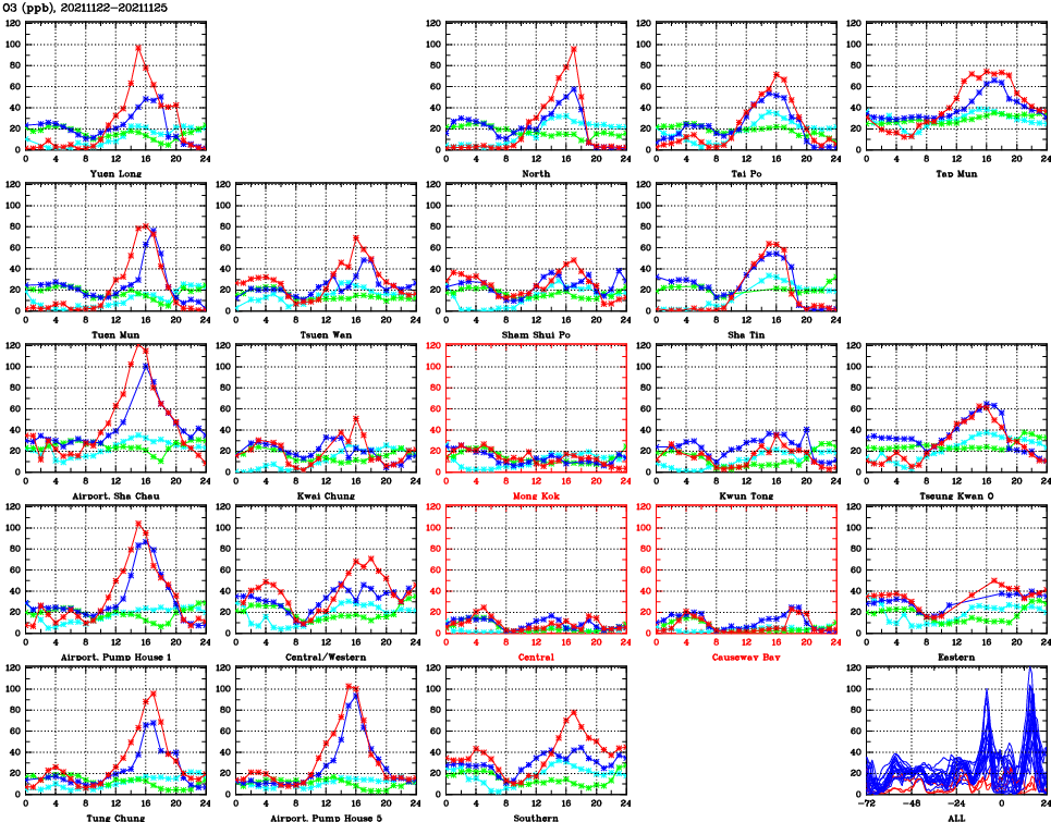 | Air Quality Data Time Series for O3 (2021/11/25) | ( Line colors: Day -3 Day -2 Day -1 Current day ) | 2D Map Current AQHI |