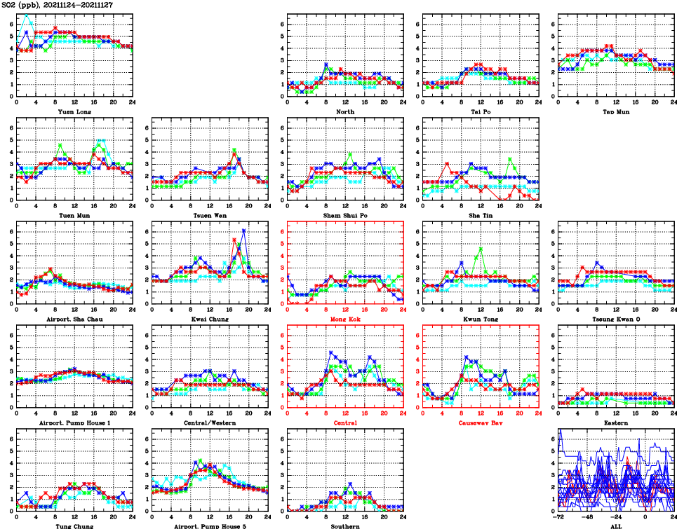 | Air Quality Data Time Series for SO2 (2021/11/27) | ( Line colors: Day -3 Day -2 Day -1 Current day ) | 2D Map Current AQHI |