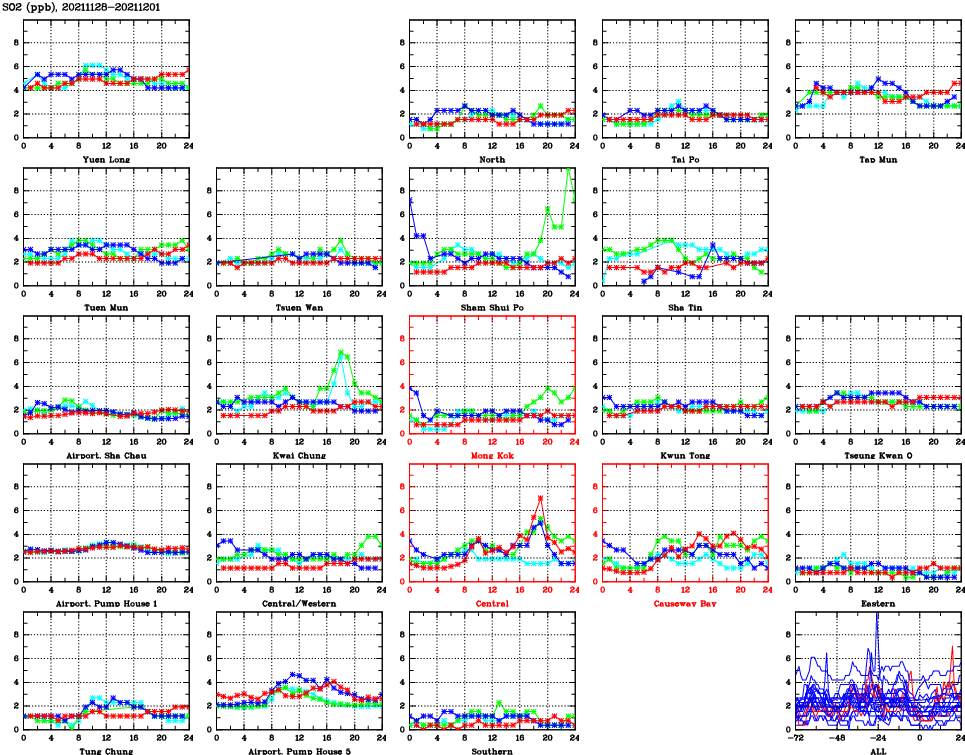 | Air Quality Data Time Series for SO2 (2021/12/01) | ( Line colors: Day -3 Day -2 Day -1 Current day ) | 2D Map Current AQHI |