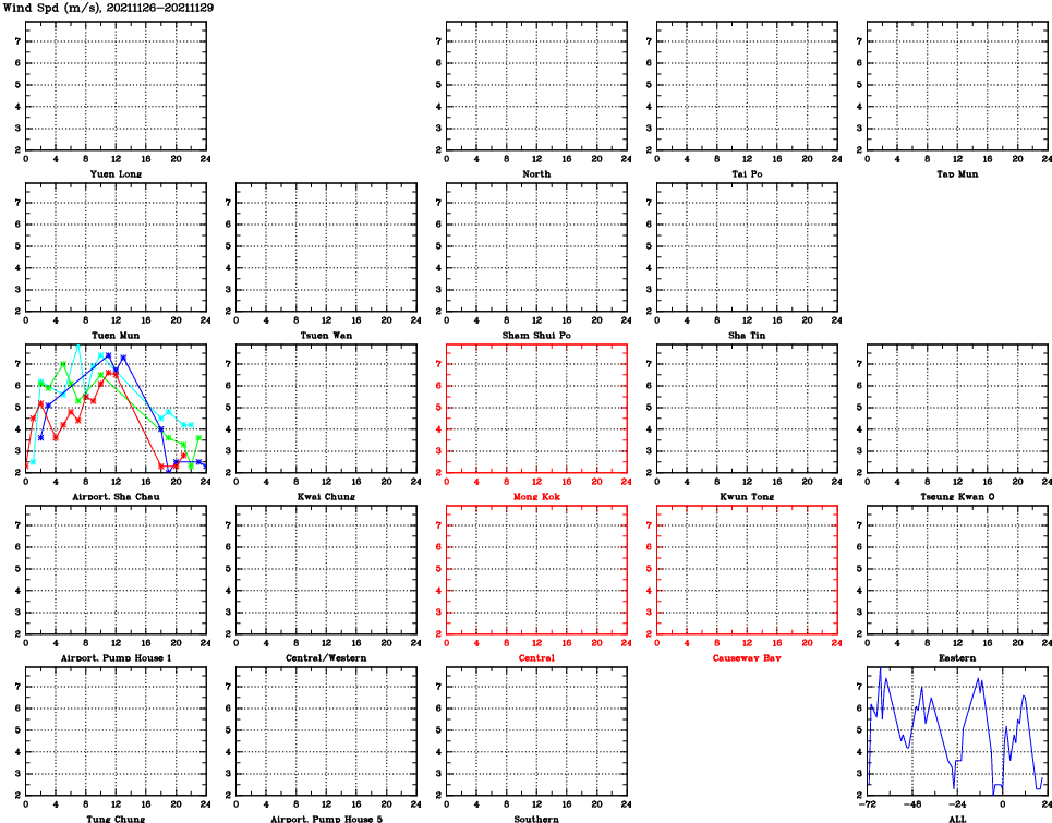 | Air Quality Data Time Series for WS (2021/11/29) | ( Line colors: Day -3 Day -2 Day -1 Current day ) | 2D Map Current AQHI |