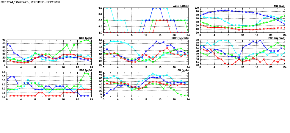 | Air Quality Data Time Series in Central/Western (2021/12/01) | ( Line colors: Day -3 Day -2 Day -1 Current day ) | 2D Map Current AQHI |