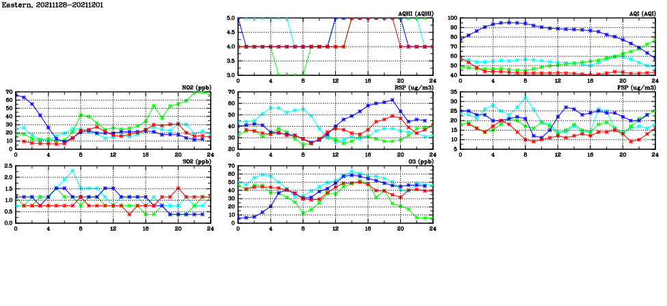 | Air Quality Data Time Series in Eastern (2021/12/01) | ( Line colors: Day -3 Day -2 Day -1 Current day ) | 2D Map Current AQHI |