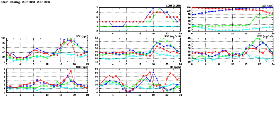 | Air Quality Data Time Series in Kwai Chung (2021/11/26) | ( Line colors: Day -3 Day -2 Day -1 Current day ) | 2D Map Current AQHI |