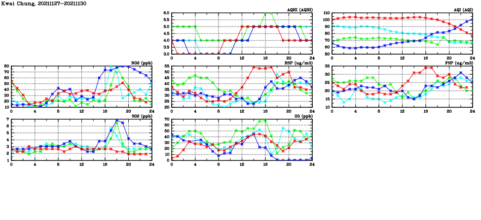 | Air Quality Data Time Series in Kwai Chung (2021/11/30) | ( Line colors: Day -3 Day -2 Day -1 Current day ) | 2D Map Current AQHI |