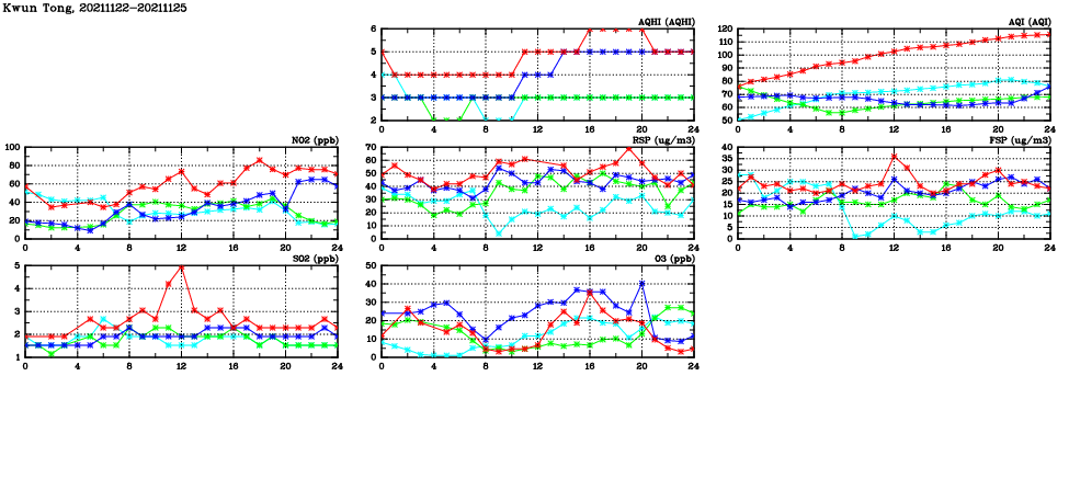 | Air Quality Data Time Series in Kwun Tong (2021/11/25) | ( Line colors: Day -3 Day -2 Day -1 Current day ) | 2D Map Current AQHI |
