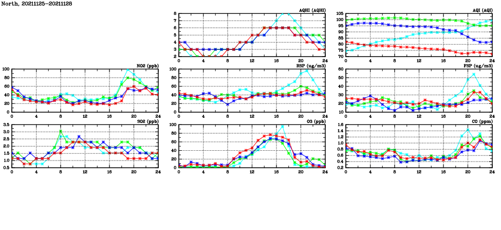 | Air Quality Data Time Series in North (2021/11/28) | ( Line colors: Day -3 Day -2 Day -1 Current day ) | 2D Map Current AQHI |