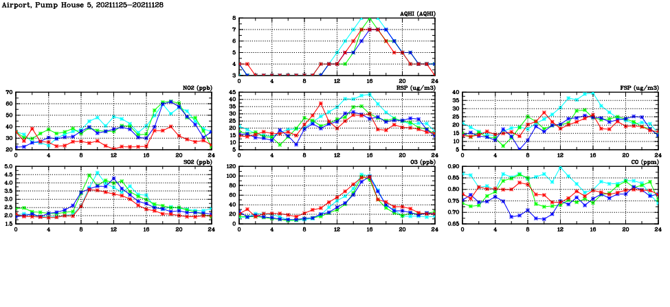 | Air Quality Data Time Series in Airport, Pump House 5 (2021/11/28) | ( Line colors: Day -3 Day -2 Day -1 Current day ) | 2D Map Current AQHI |