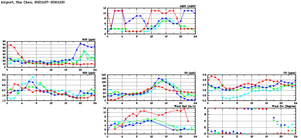 | Air Quality Data Time Series in Airport, Sha Chau (2021/11/30) | ( Line colors: Day -3 Day -2 Day -1 Current day ) | 2D Map Current AQHI |
