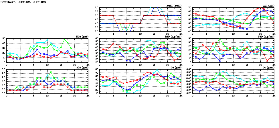 | Air Quality Data Time Series in Southern (2021/11/28) | ( Line colors: Day -3 Day -2 Day -1 Current day ) | 2D Map Current AQHI |