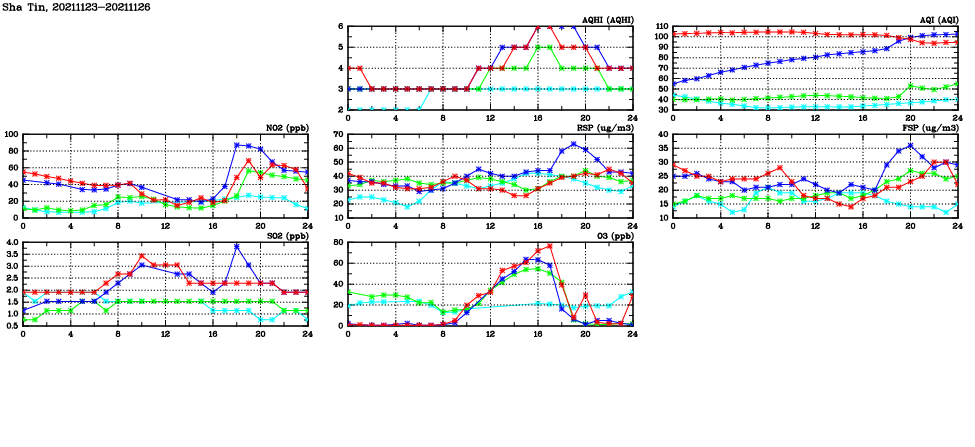 | Air Quality Data Time Series in Sha Tin (2021/11/26) | ( Line colors: Day -3 Day -2 Day -1 Current day ) | 2D Map Current AQHI |