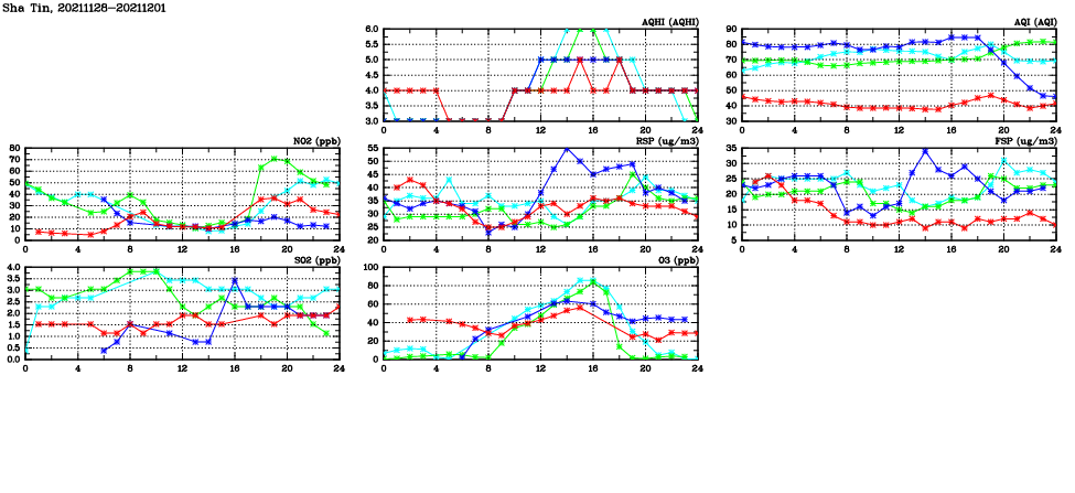 | Air Quality Data Time Series in Sha Tin (2021/12/01) | ( Line colors: Day -3 Day -2 Day -1 Current day ) | 2D Map Current AQHI |