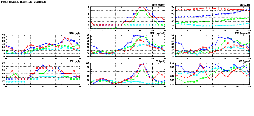 | Air Quality Data Time Series in Tung Chung (2021/11/26) | ( Line colors: Day -3 Day -2 Day -1 Current day ) | 2D Map Current AQHI |