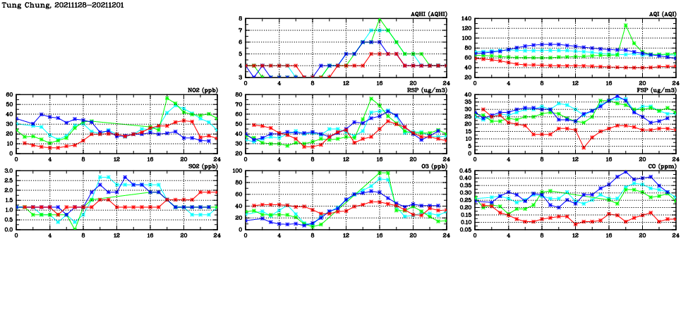 | Air Quality Data Time Series in Tung Chung (2021/12/01) | ( Line colors: Day -3 Day -2 Day -1 Current day ) | 2D Map Current AQHI |