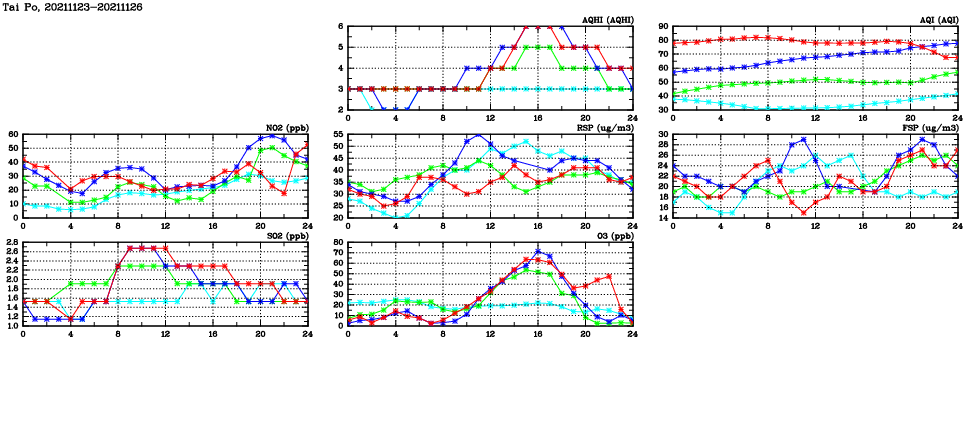 | Air Quality Data Time Series in Tai Po (2021/11/26) | ( Line colors: Day -3 Day -2 Day -1 Current day ) | 2D Map Current AQHI |