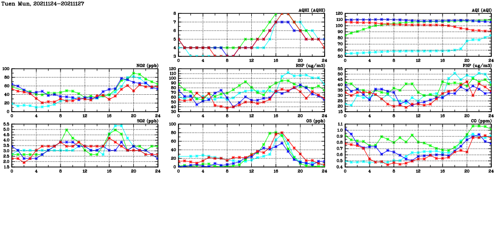 | Air Quality Data Time Series in Tuen Mun (2021/11/27) | ( Line colors: Day -3 Day -2 Day -1 Current day ) | 2D Map Current AQHI |