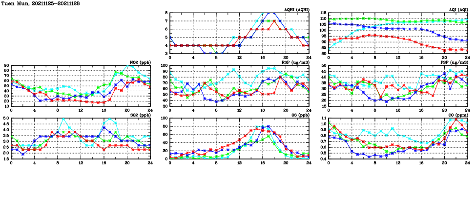 | Air Quality Data Time Series in Tuen Mun (2021/11/28) | ( Line colors: Day -3 Day -2 Day -1 Current day ) | 2D Map Current AQHI |