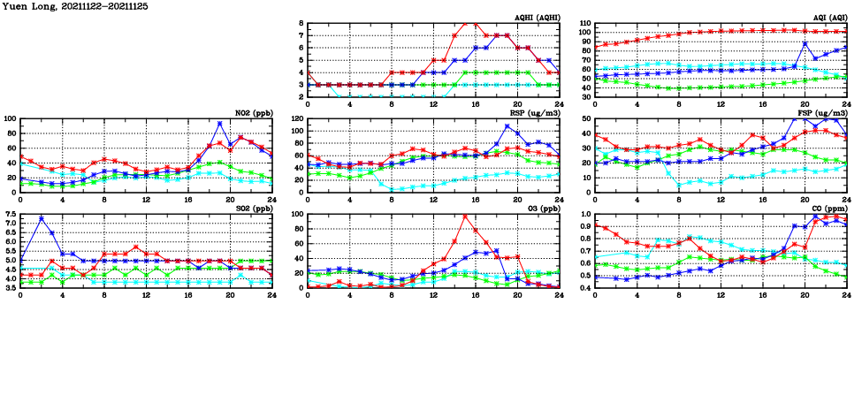 | Air Quality Data Time Series in Yuen Long (2021/11/25) | ( Line colors: Day -3 Day -2 Day -1 Current day ) | 2D Map Current AQHI |