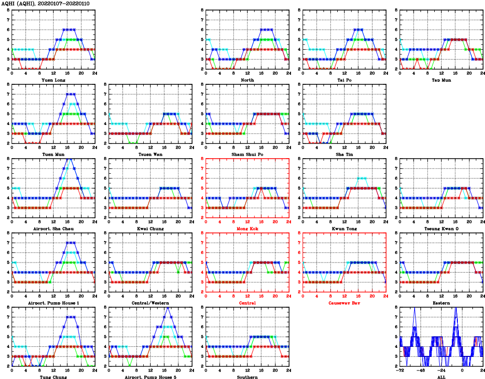| Air Quality Data Time Series for AQHI (2022/01/10) | ( Line colors: Day -3 Day -2 Day -1 Current day ) | 2D Map Current AQHI |