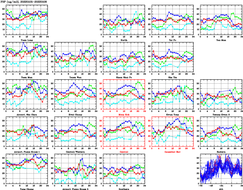| Air Quality Data Time Series for FSP (2022/01/08) | ( Line colors: Day -3 Day -2 Day -1 Current day ) | 2D Map Current AQHI |