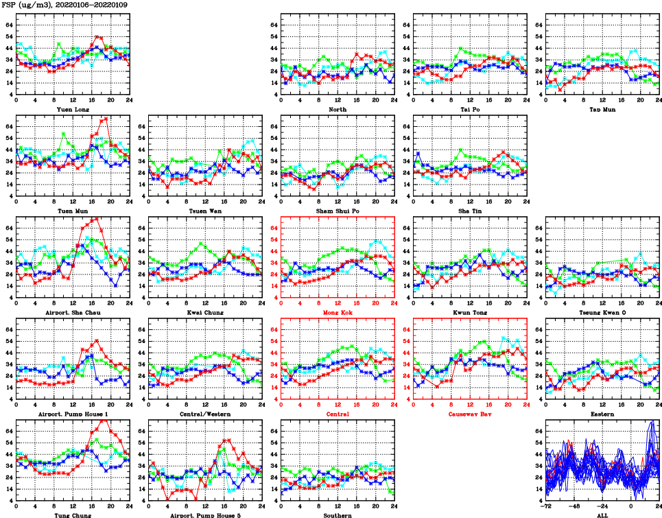 | Air Quality Data Time Series for FSP (2022/01/09) | ( Line colors: Day -3 Day -2 Day -1 Current day ) | 2D Map Current AQHI |