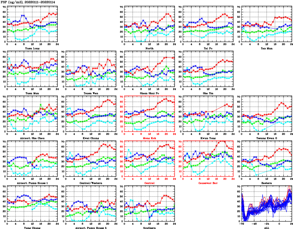 | Air Quality Data Time Series for FSP (2022/01/14) | ( Line colors: Day -3 Day -2 Day -1 Current day ) | 2D Map Current AQHI |