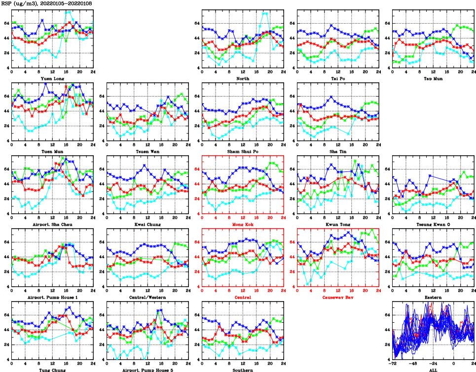 | Air Quality Data Time Series for RSP (2022/01/08) | ( Line colors: Day -3 Day -2 Day -1 Current day ) | 2D Map Current AQHI |