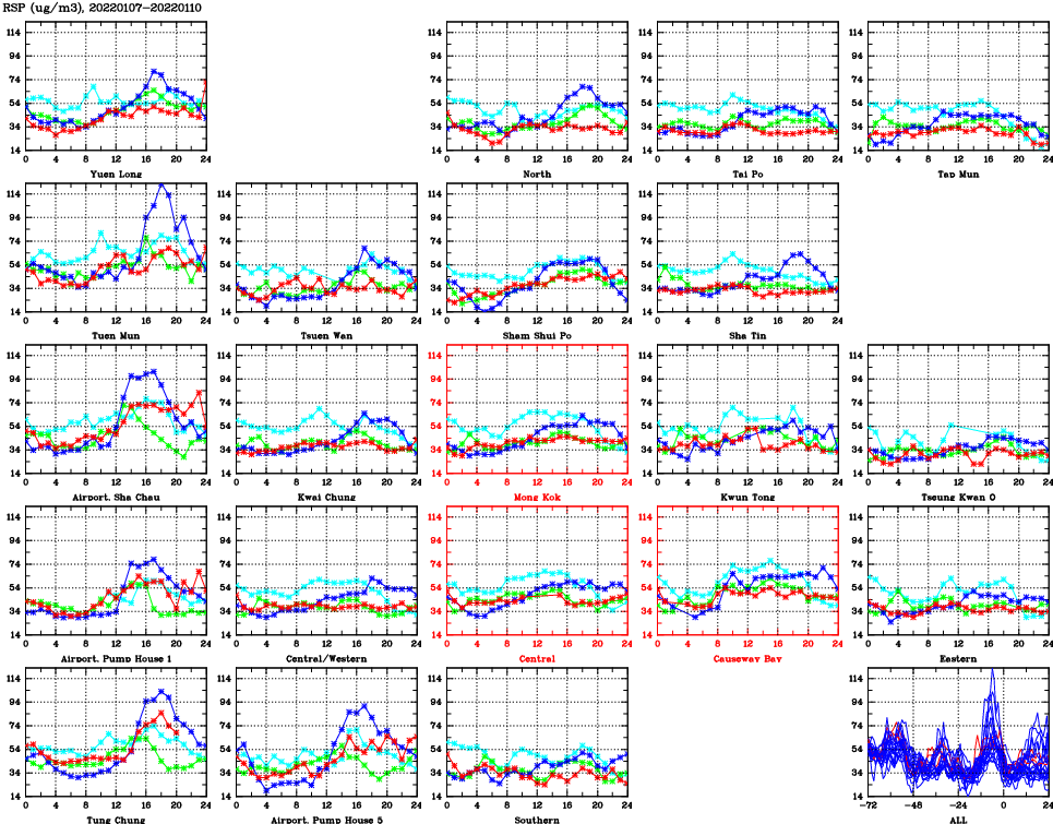 | Air Quality Data Time Series for RSP (2022/01/10) | ( Line colors: Day -3 Day -2 Day -1 Current day ) | 2D Map Current AQHI |