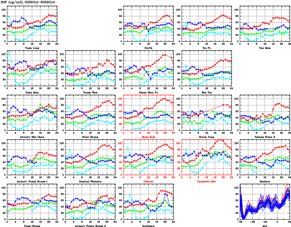 | Air Quality Data Time Series for RSP (2022/01/14) | ( Line colors: Day -3 Day -2 Day -1 Current day ) | 2D Map Current AQHI |
